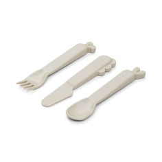 El juego de cubiertos Kiddish con amigos Deer tiene formas redondeadas para que los niños pequeños practiquen comer solos de forma segura. Los cubiertos están bien dimensionados para manos pequeñas y los niños los han probado minuciosamente. Los cubiertos Kiddish para bebés y niños pequeños se fabrican en Dinamarca y son reciclables. Cuando los cubiertos se desgastan, se pueden clasificar como plástico duro y reciclarlos para producir nuevos productos para la vida cotidiana. El bonito juego de cubiertos de arena consta de una cuchara con orejas de Lalee, un tenedor con orejas de Raffi y un cuchillo con escamas de Croco. Los cubiertos tienen una superficie mate sedosa y combinan con el resto de la colección Kiddish.