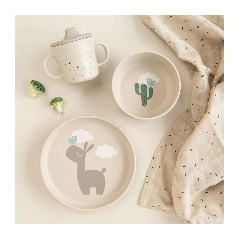 Deje que su pequeño comensal disfrute de una comida de este lindo y práctico juego de vajilla Foodie. Su divertido estampado aportará alegría a cada comida. El borde alto del plato y del cuenco y la práctica base de succión Stick & Stay ayudarán a su hijo a comer solo. La vajilla está diseñada para el día a día con niños y es apta para lavavajillas y microondas. Una vez que la vajilla ha cumplido su función en innumerables cenas familiares, se puede clasificar como plástico y reciclarla para convertirla en nuevos productos de la vida cotidiana. La vajilla de color arena tiene un bonito estampado. El plato tiene un motivo de Lalee y Birdee y el cuenco tiene un motivo de Birdee sobre un cactus. Se ha esparcido confeti sobre el recipiente y el vaso con boquilla de dos asas.