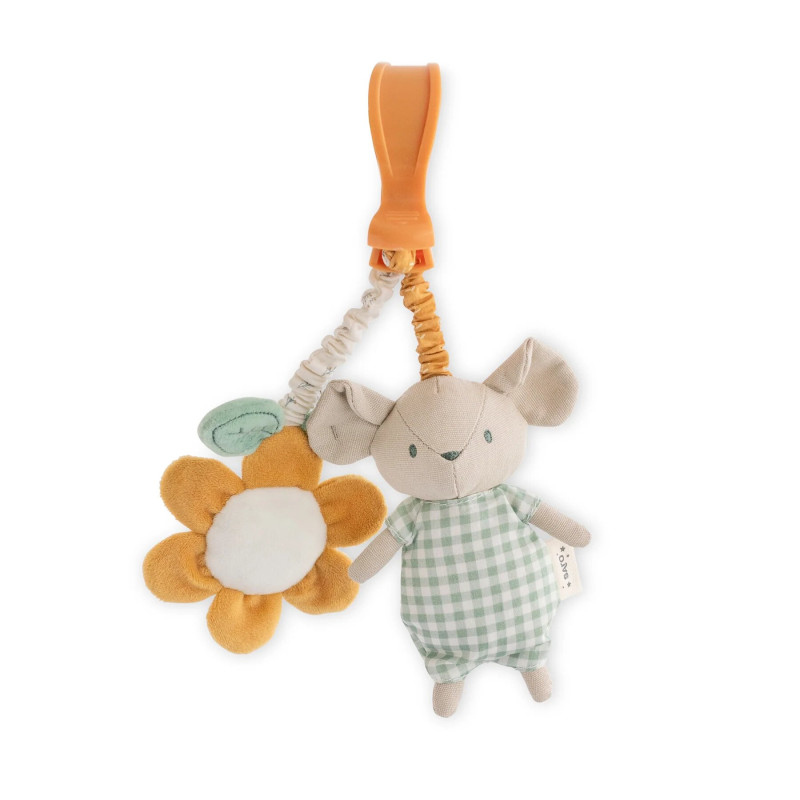 Los paseos serán más divertidos gracias a este suave animalito. Tira de sus patitas para ver cómo salta, volviendo a su posición a ritmo de cascabel. Cuenta con un suave peluche con sonajero y una bonita flor con espejito y papel crujiente. Además gracias a su pinza podrá acompañar a tu peque en la cuna, en el carrito o en el parque. Promueve la coordinación mano-ojo y estimula la curiosidad del pequeño