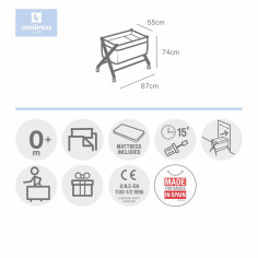 La minicuna con estructura en forma de aspa de Cambrass está fabricada en madera de haya. Permite el descanso del bebé en cualquier estancia de la casa durante los primeros meses de vida gracias a la movilidad que le aportan las ruedas (con freno).Otros aspectos que hacen especialmente funcional esta minicuna, incluye almohada, colchón y somier de madera de 5mm, soporte de madera y su vestidura cosida que incluye la colcha con relleno extraíble para su lavado o para el uso invierno / verano.. Por recomendación de la normativa Europea (EN 1130 UNE-EN 11890:2018) y del real decreto 1801/2003 sobre la seguridad general de los productos, la minicuna no puede ser plegable. Según normativa, este producto soporta bebés con un peso de hasta 14 kg