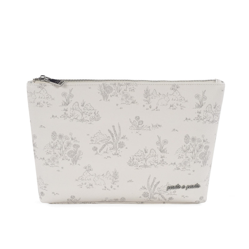 El neceser de bebé Toile de Jouy Cream de Pasito a pasito es un bolso pequeño especialmente pensado para llevar todos los productos de aseo de nuestro bebé al salir de casa. Es un modelo único con mucho estilo para adecuarse a lo que necesitas. Está elaborado en resistente y suave polipiel impresa y com una forma para acomodar fácilmente en el bolso canastilla a un lado. Es un diseño bonito, simple y cómodo que ofrece un espacio pequeño pero preciso para llevar justo lo que necesitas para la higiene de tu bebé, peine, lociones y otros objetos que por ser tan pequeños a veces se pierden dentro del bolso canastilla.