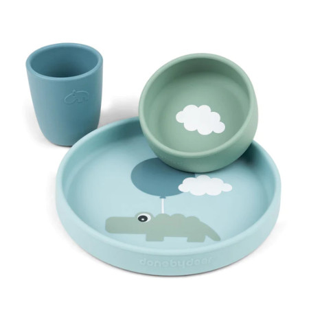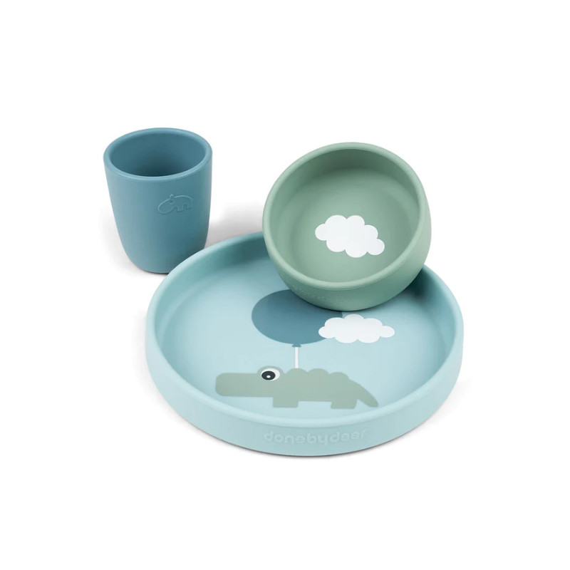 La vajilla de Silicona con Nubes Happy hará que la hora de comer sea divertida. El práctico set básico de silicona, antideslizante y de fácil agarre, incluye un plato infantil, un bol y una minitaza. Vajilla perfecta tanto para bebés como para niños pequeños. Los bordes interiores redondeados facilitan la recogida de alimentos para su pequeño. La vajilla infantil de silicona es suave y duradera, resistente al calor y apta para microondas, horno, congelador y lavavajillas. Un plato Croco azul, un tazón de nube verde y una minitaza azul oscuro hacen de este juego de comida para niños una idea de regalo perfecta para los más pequeños.