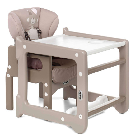 Trona convertible en mesa y silla, con 4 inclinaciones de respaldo y 3 posiciones de bandeja. Sobrebandeja extraíble y tapizado desenfundable.