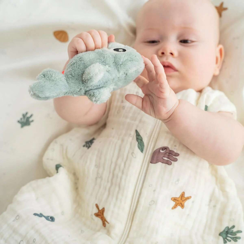 A Wally le encanta jugar y entretener a los más pequeños. Este sonajero de ballena es un primer juguete perfecto para que lo agarren los dedos pequeños, listos para descubrir las características sensoriales y los dulces sonidos. Intenta darle un suave apretón a la cola de Wally y escucha el emocionante sonido del crujido. A los deditos les encantará sentir la suave textura del juguete para bebé, mientras que los sonidos del sonajero y el crujido despertarán la curiosidad por explorar. Con el lazo elástico, es fácil sujetar el pequeño sonajero sensorial a una alfombra de juego, un cochecito, un asiento para el automóvil o un centro de actividades usando un enlace de juguete. El pequeño sonajero de ballena súper suave es de un suave tono azul.