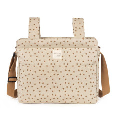 Bolso cambiador Poppy Canela con corazones para silla de paseo que incluye cambiador para bebe. Bolsa canastilla muy ligera, resistente y de gran capacidad para llevar todo lo necesario para el paseo del bebe. Tiene multiples bolsillos para poder tener todo ordenado. Dispone en el exterior de un práctico bolsillo frontal para tener a mano lo imprescindible. En el interior incopora un bolsillo plastificado para la ropa húmeda, un bolsillo térmico para biberones y dos bolsillos para lo que necesites tener más a mano. La bolsa tiene un sistema universal de fijación, con 2 asas cortas que facilita la colocación en la silla de paseo. También incorpora una asa larga para poder colgarla en el hombro. Gran calidad y mucho estilo