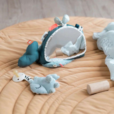 Los más pequeños se entretienen con su propio reflejo, lo que hace que el espejo de suelo Wally sea ideal para animar a los bebés a disfrutar del tiempo boca abajo. Las numerosas características sensoriales les animarán a permanecer boca abajo durante más tiempo y de forma más activa. El espejo para bebé, las etiquetas de colores, las texturas táctiles, los sonidos de arrugas y campanas estimularán a los más pequeños. Al sentarse, los pequeños pueden sacar las gotas de agua y sentir cómo todo se agita o explorar cómo el pez amigo de Wally se esconde dentro de la aleta de Wally. Las muchas características de Wally apoyarán el desarrollo de su bebé desde que está boca abajo hasta que se sienta y explora. La linda ballena se mantiene firme en el suelo con su saco de arena relleno.