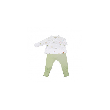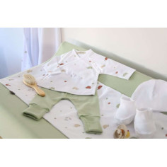 Conjunto de punto liso de algodón compuesto por:JUBÓN estampado, de corte kimono POLAINA de color verde musgo liso, con cinturilla de canalé.Talla 0-1