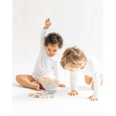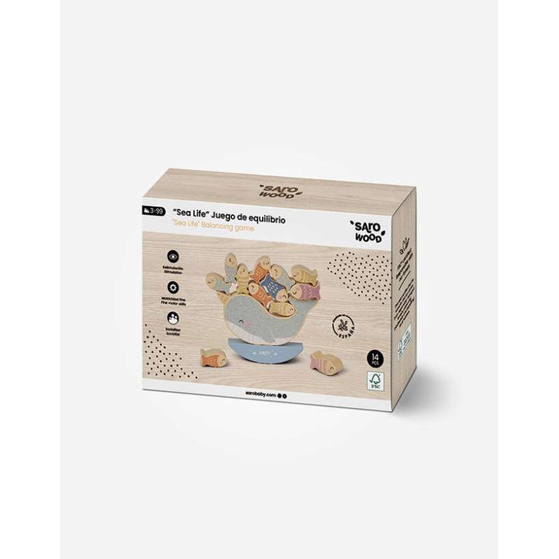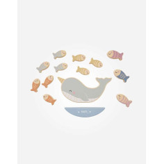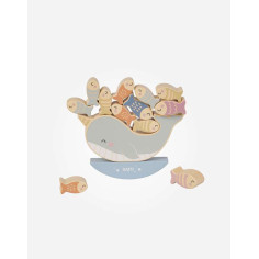 ¡Cuidado con el oleaje! Este juego de equilibrio pondrá a prueba la habilidad de toda la familia. Consiste en colocar tantos pececitos como sea posible sobre el narval sin que se caigan. Coloca el gran narval sobre el balancín y, en grupo o tú solo, con mucho cuidado, apila los pececitos. ¿Conseguirás ponerlos todos antes de que se caigan? Madera FSC. Contiene 14 piezas