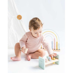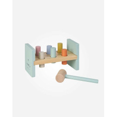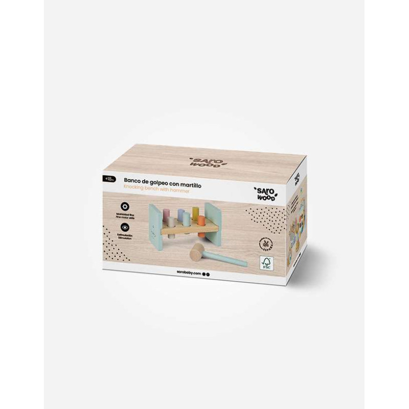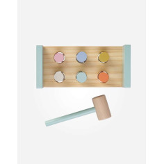 ¡Pum! ¡Pum! Este divertido banco, se convertirá en el juguete favorito de tu peque. Seis cilindros de colores listos para ser golpeados con un martillo de madera. Madera FSC.