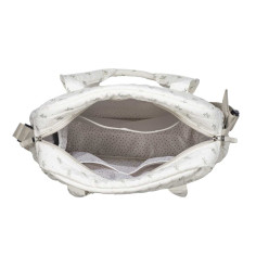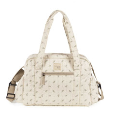 Bolso cambiador Mimosa Verde con estampado floral para silla de paseo que incluye cambiador para bebe. Bolsa canastilla muy ligera, resistente y de gran capacidad para llevar todo lo necesario para el paseo del bebe. Tiene multiples bolsillos para poder tener todo ordenado. Dispone en el exterior de dos bolsillos laterales para botellas o biberones y un bolsillo con cremallera frontal. En el interior incopora un bolsillo plastificado para la ropa húmeda, un bolsillo térmico para biberones y dos bolsillos para lo que necesites tener más a mano. La bolsa tiene un sistema universal de fijación, con 2 asas cortas ajustables que facilita la colocación en cualquier modelo de silla de paseo. También incorpora una asa larga para poder colgarla en el hombro y asas cortas para cogerla con la mano